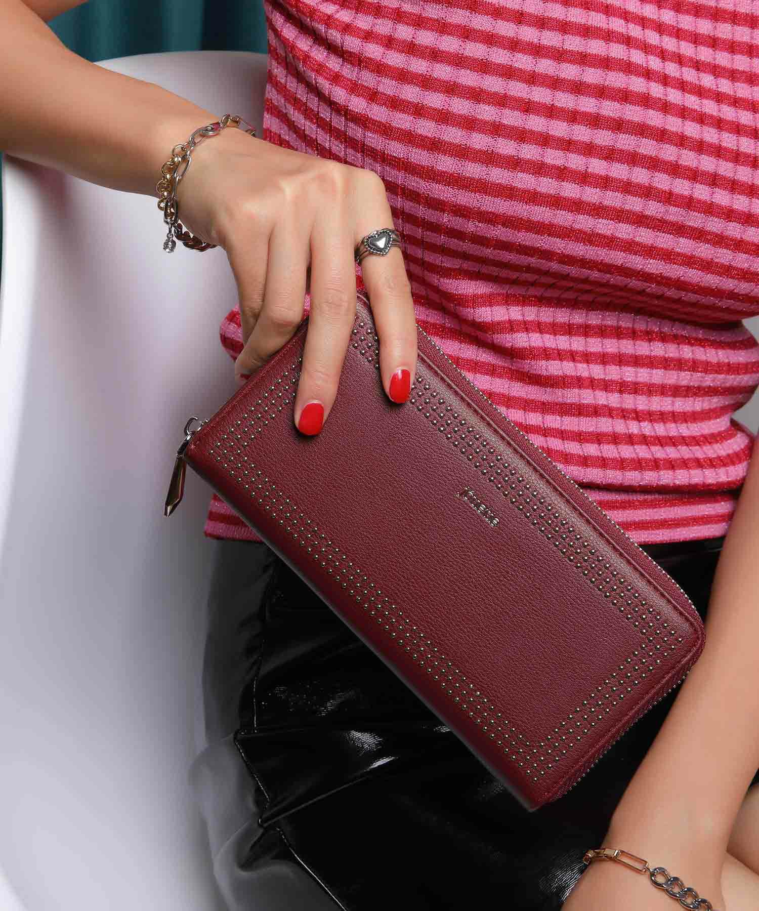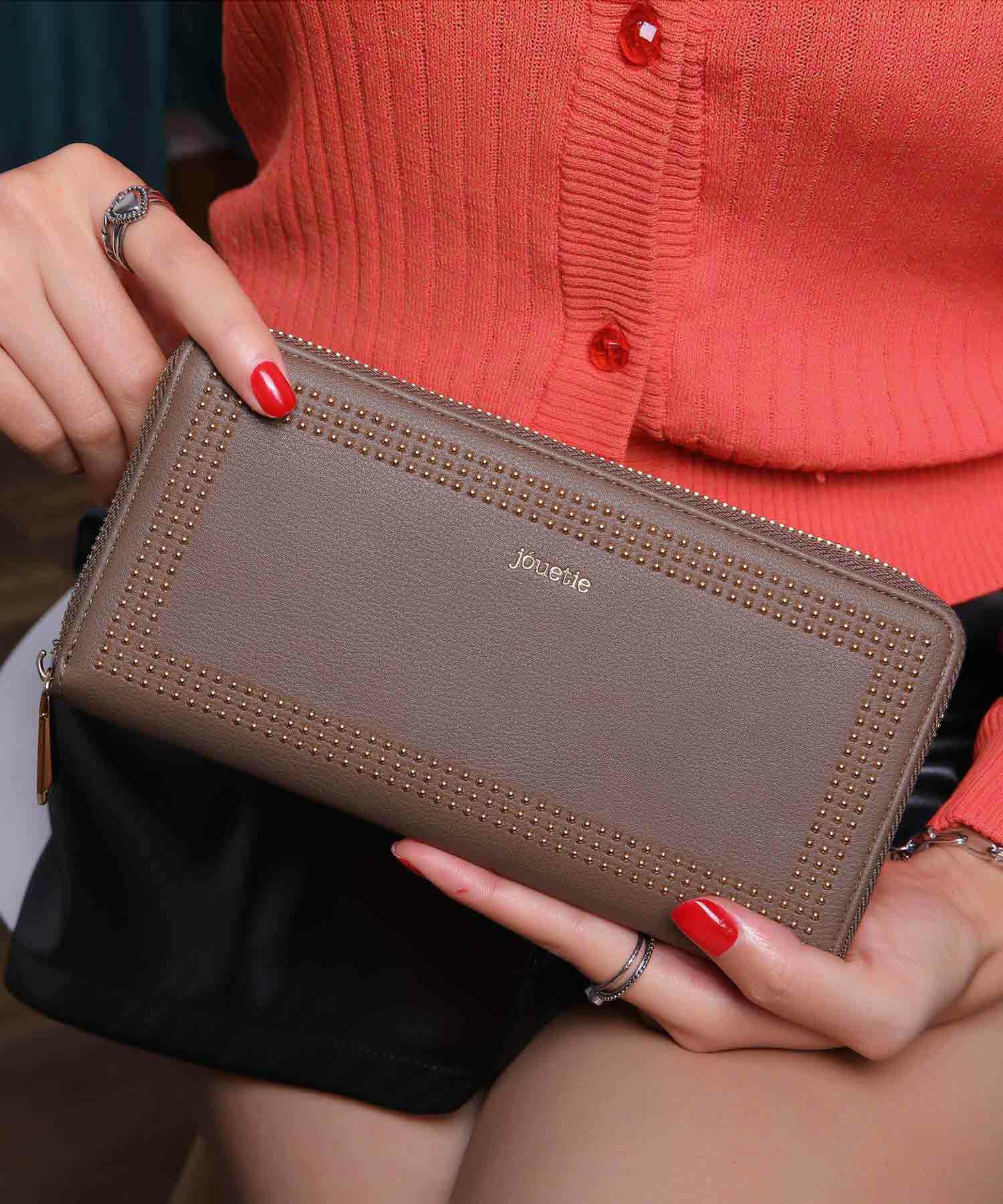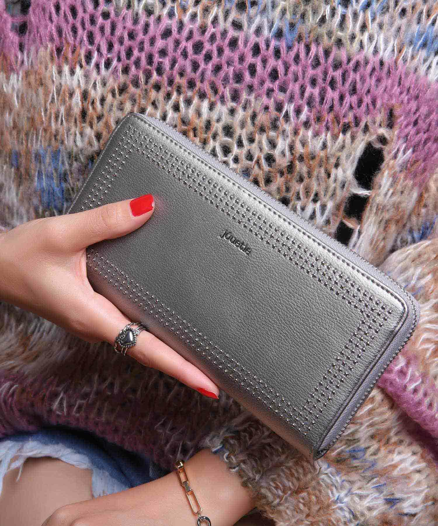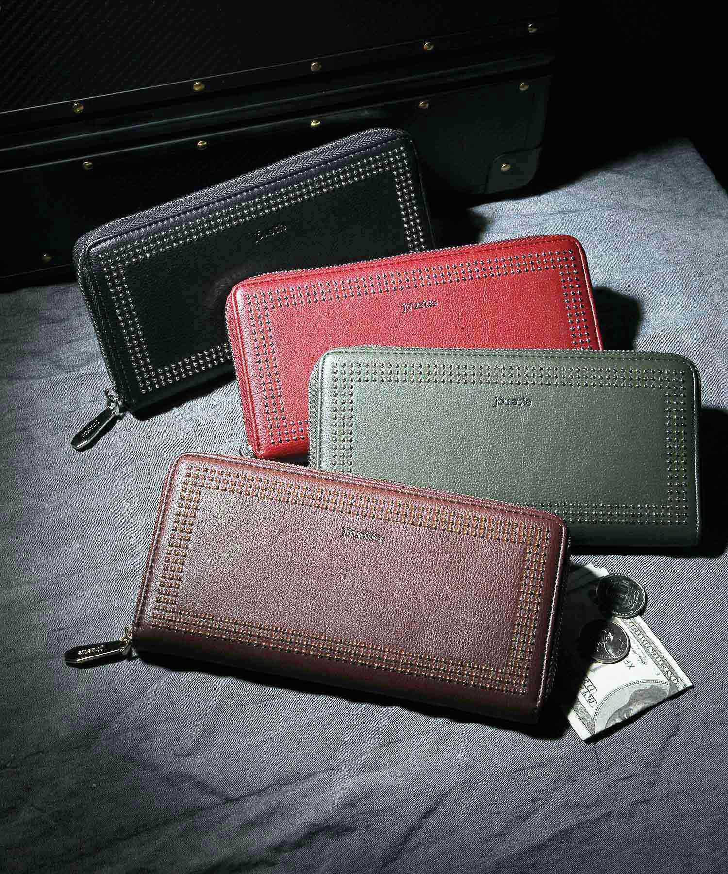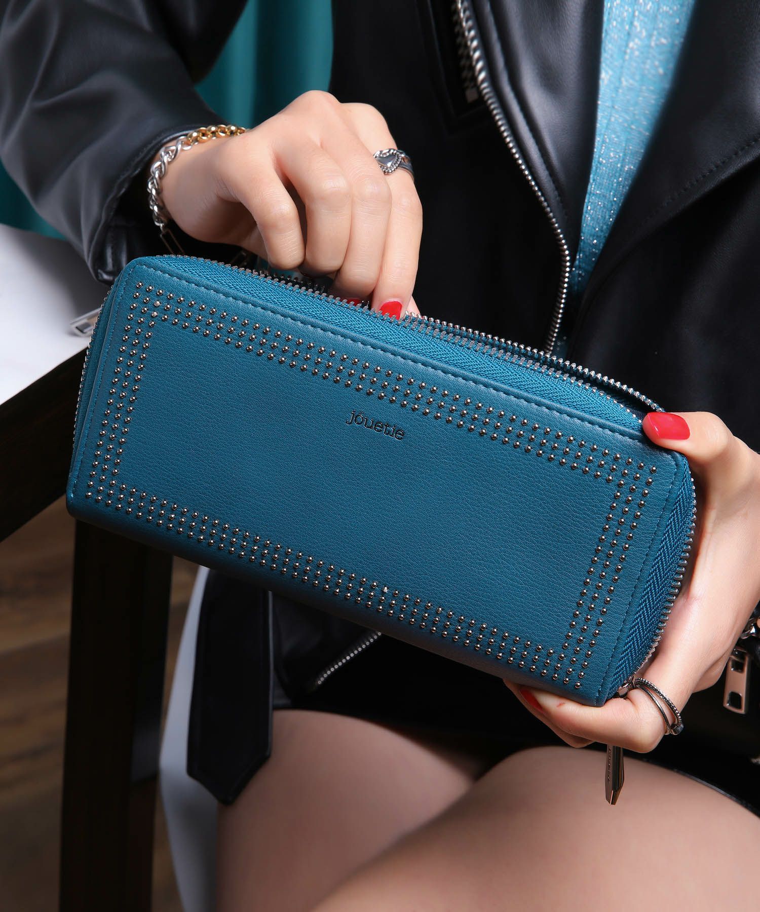シンプルをベースにjouetieのロゴとマイクロスタッズがアクセントの長財布。
