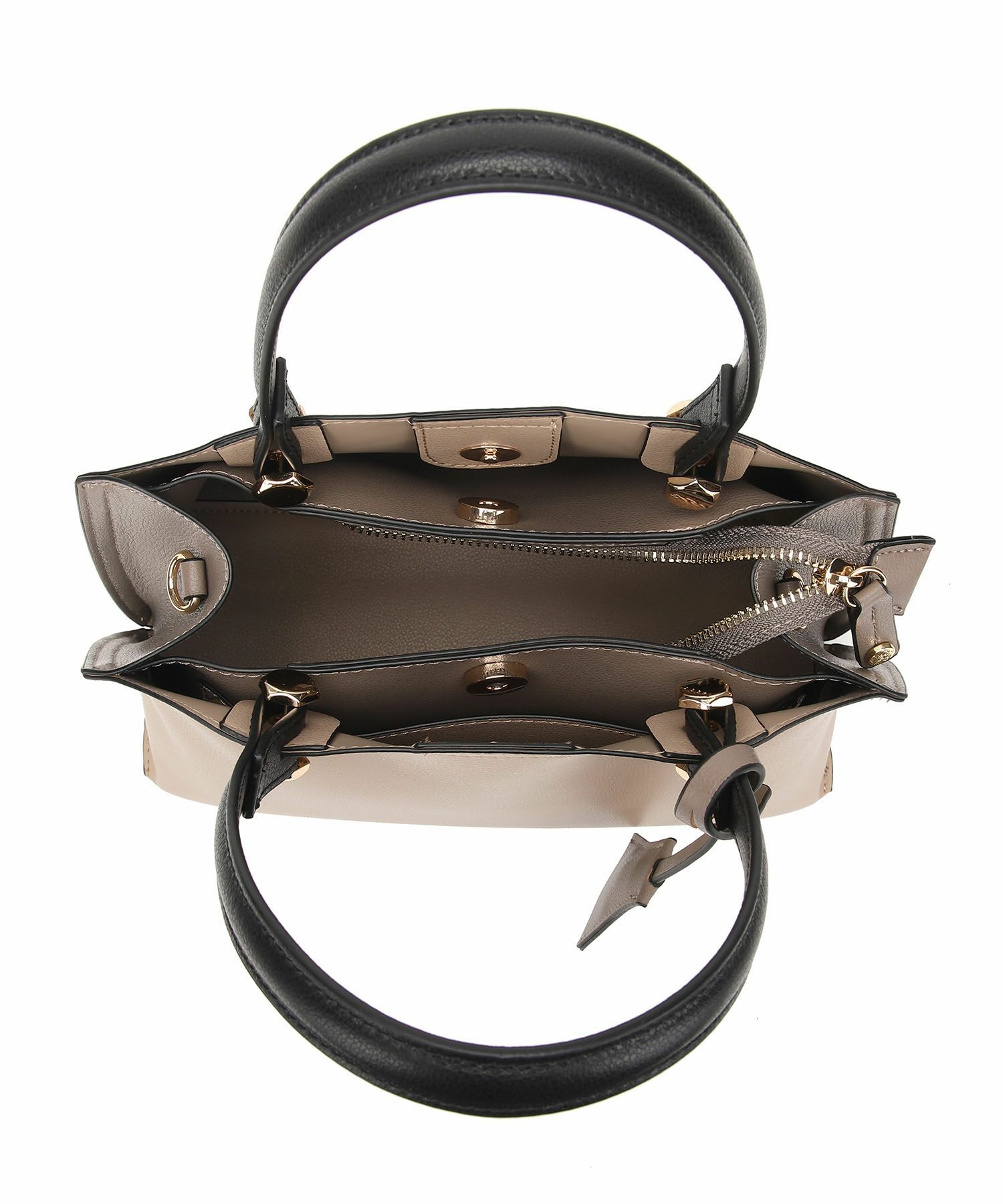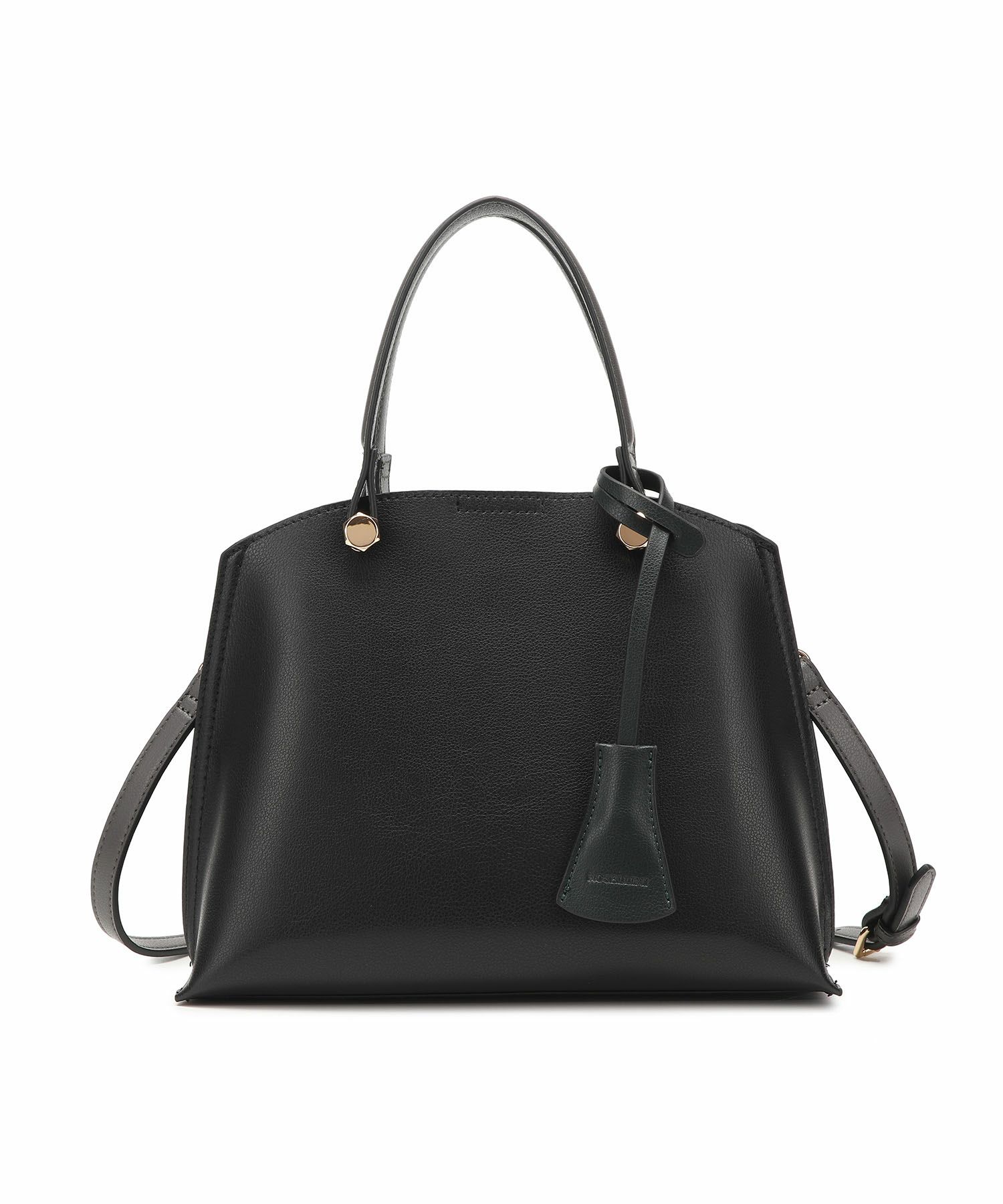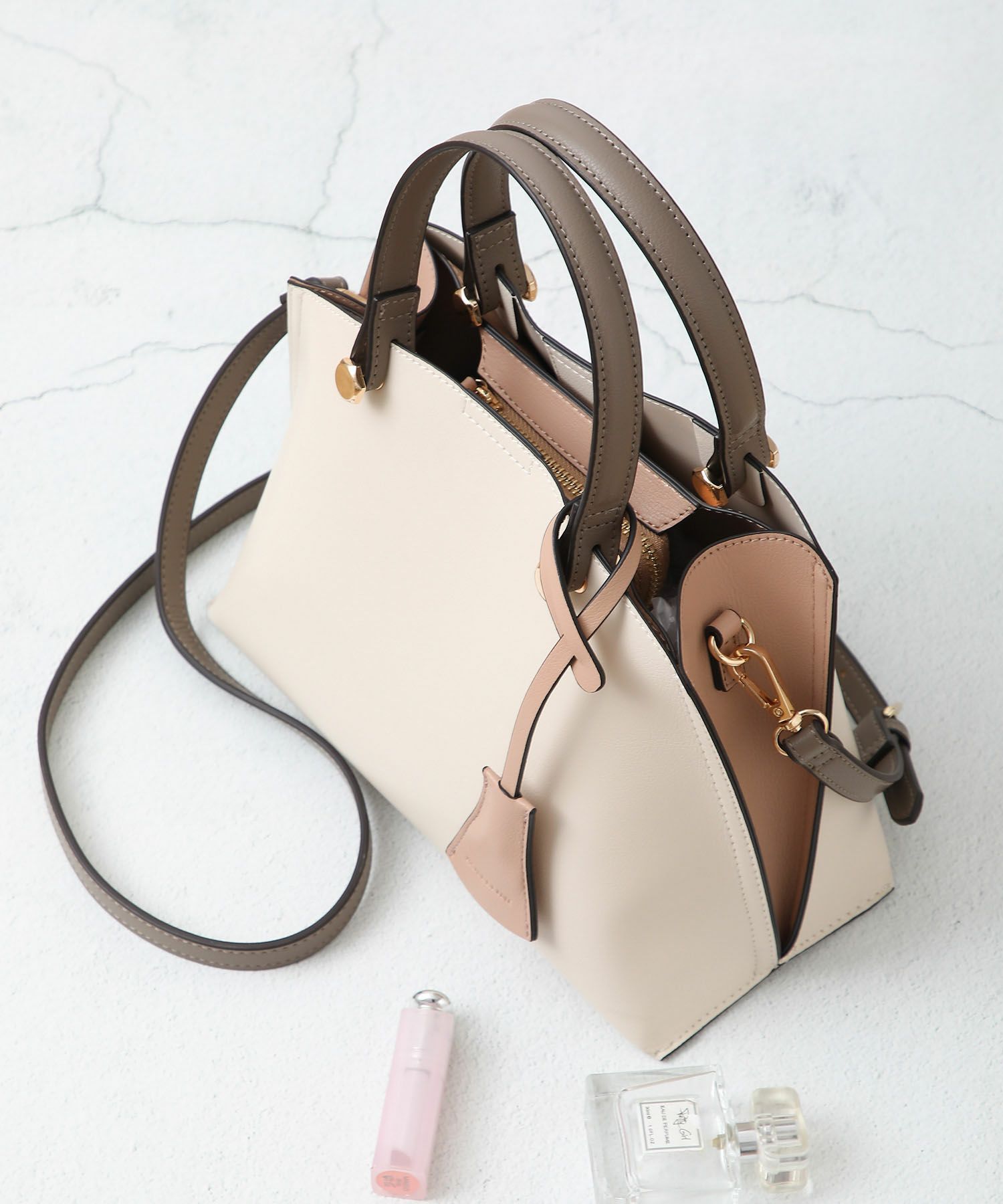 遊び心がある両サイドのバイカラー配色と同色のキーチャームがポイントのハンドバッグ。