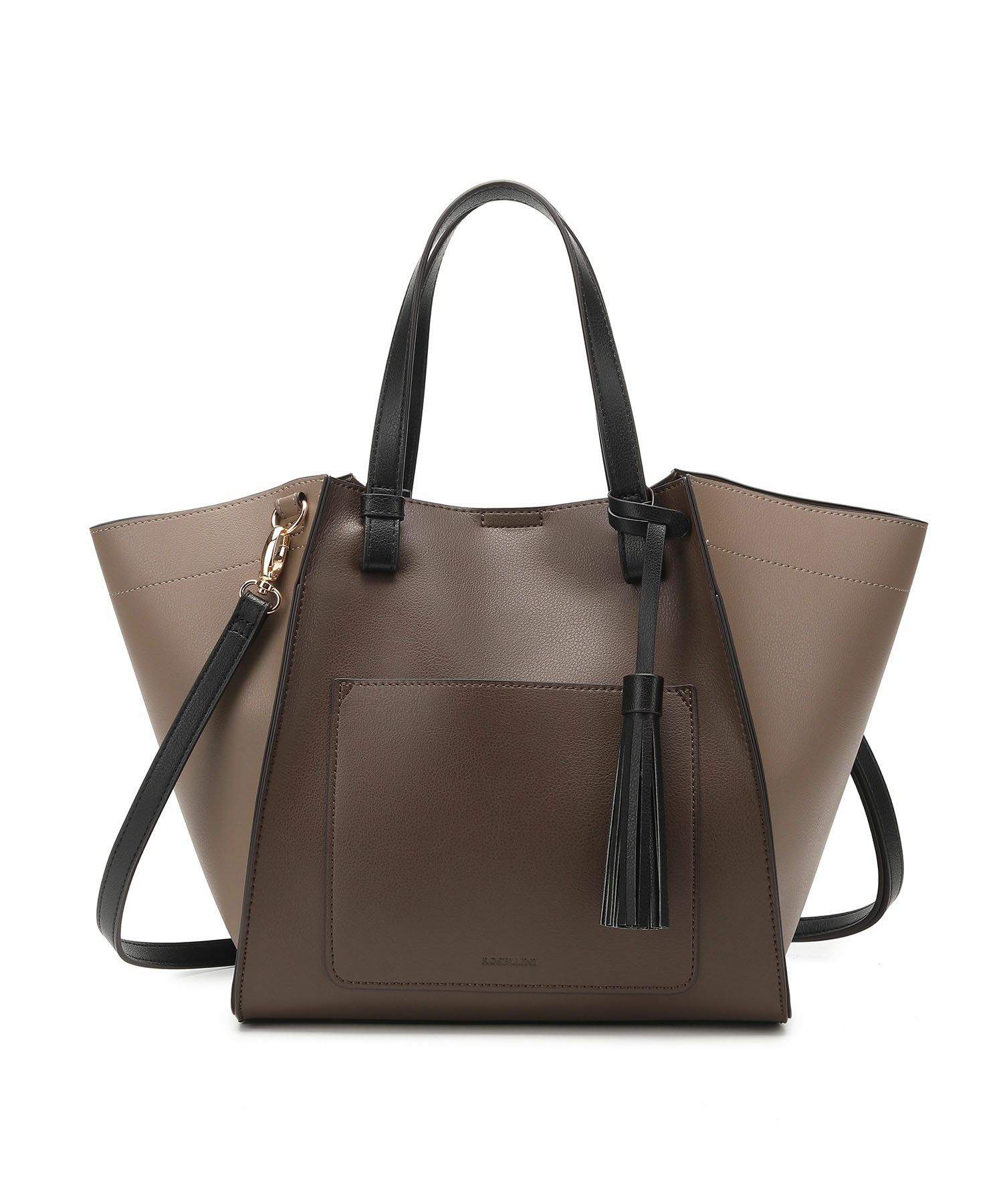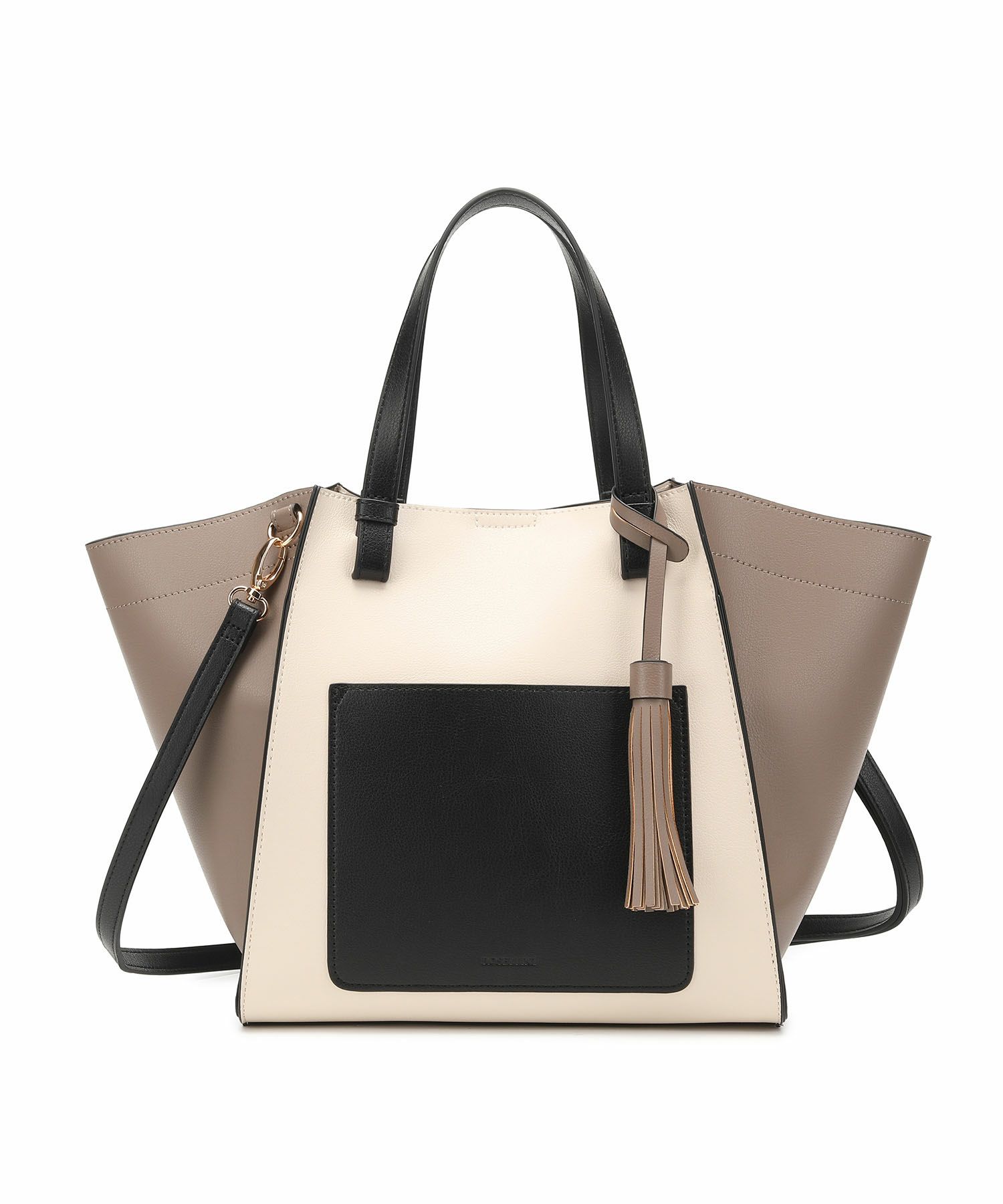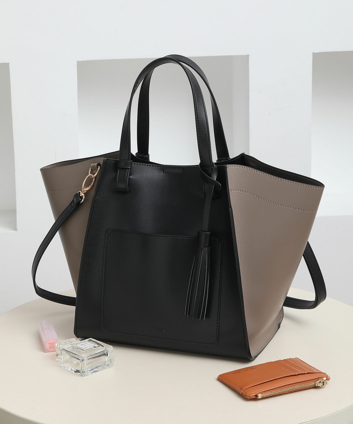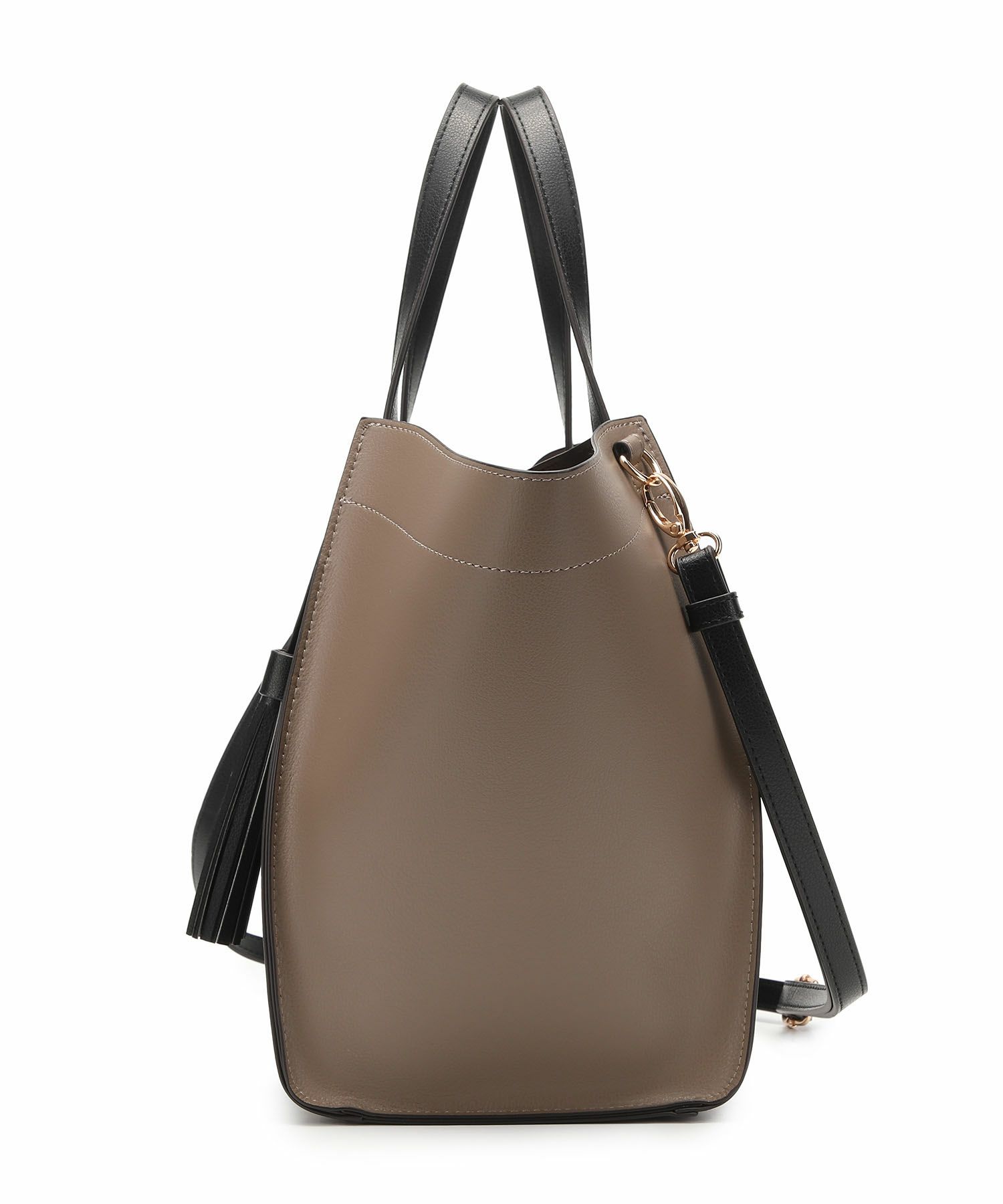 シンプルなデザインながらバイカラーと取り外し可能のタッセルチャームがアクセントになったバッグ。