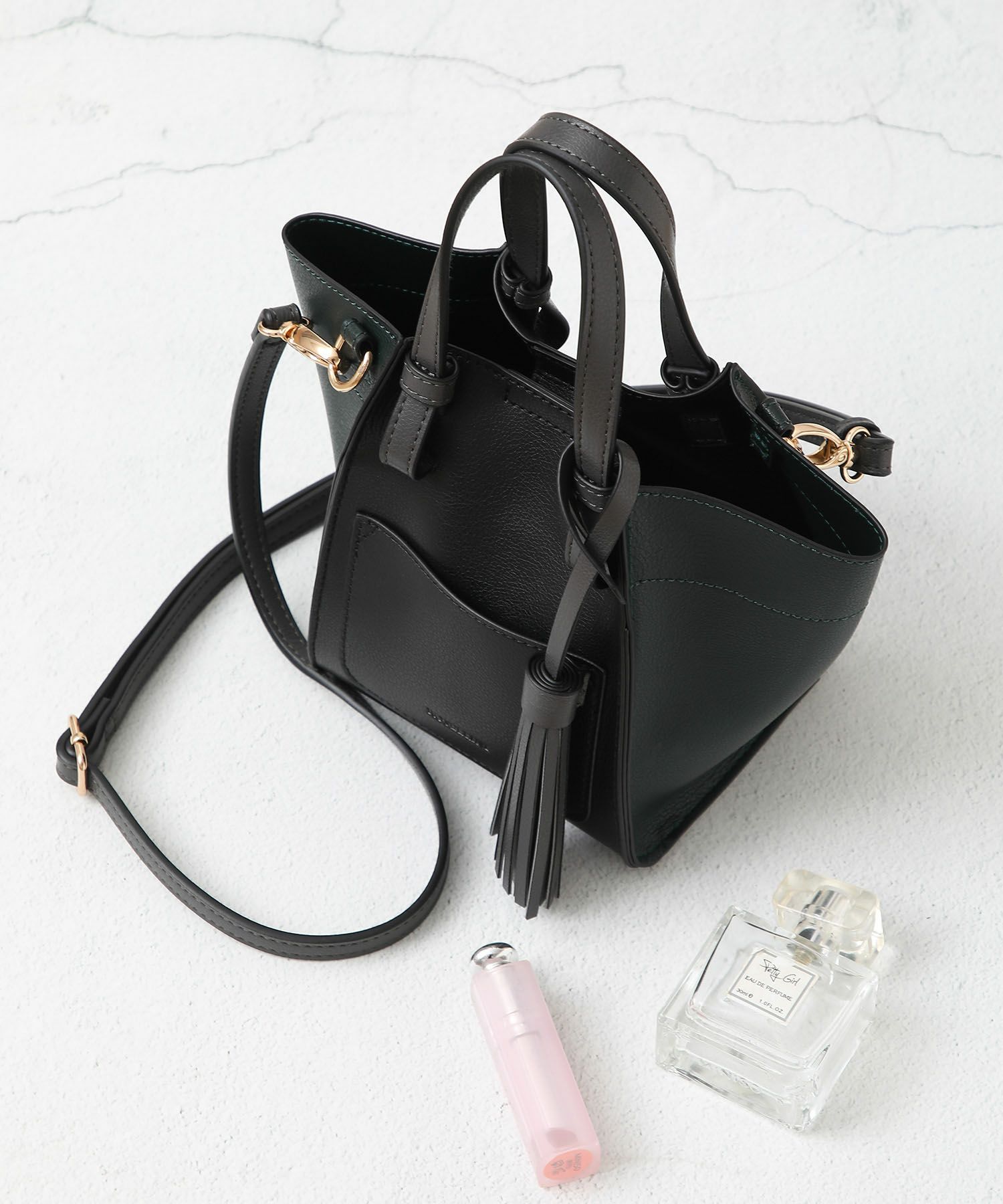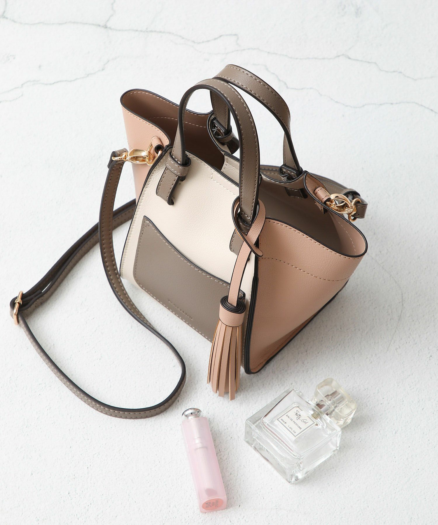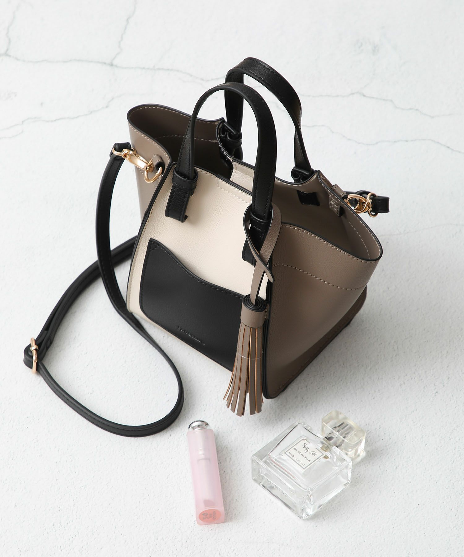 シンプルなデザインながらバイカラーと取り外し可能のタッセルチャームがアクセントになったバッグ。