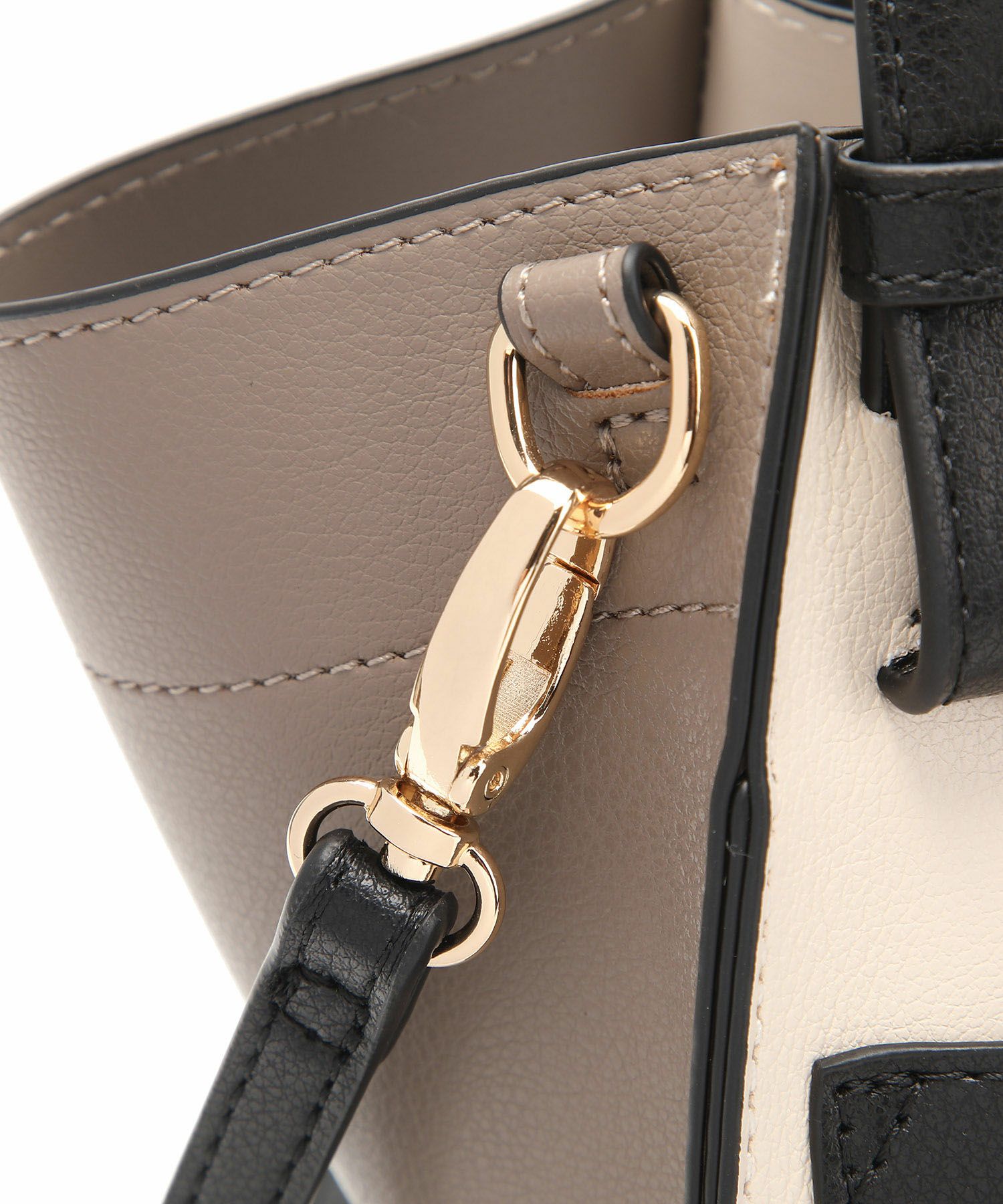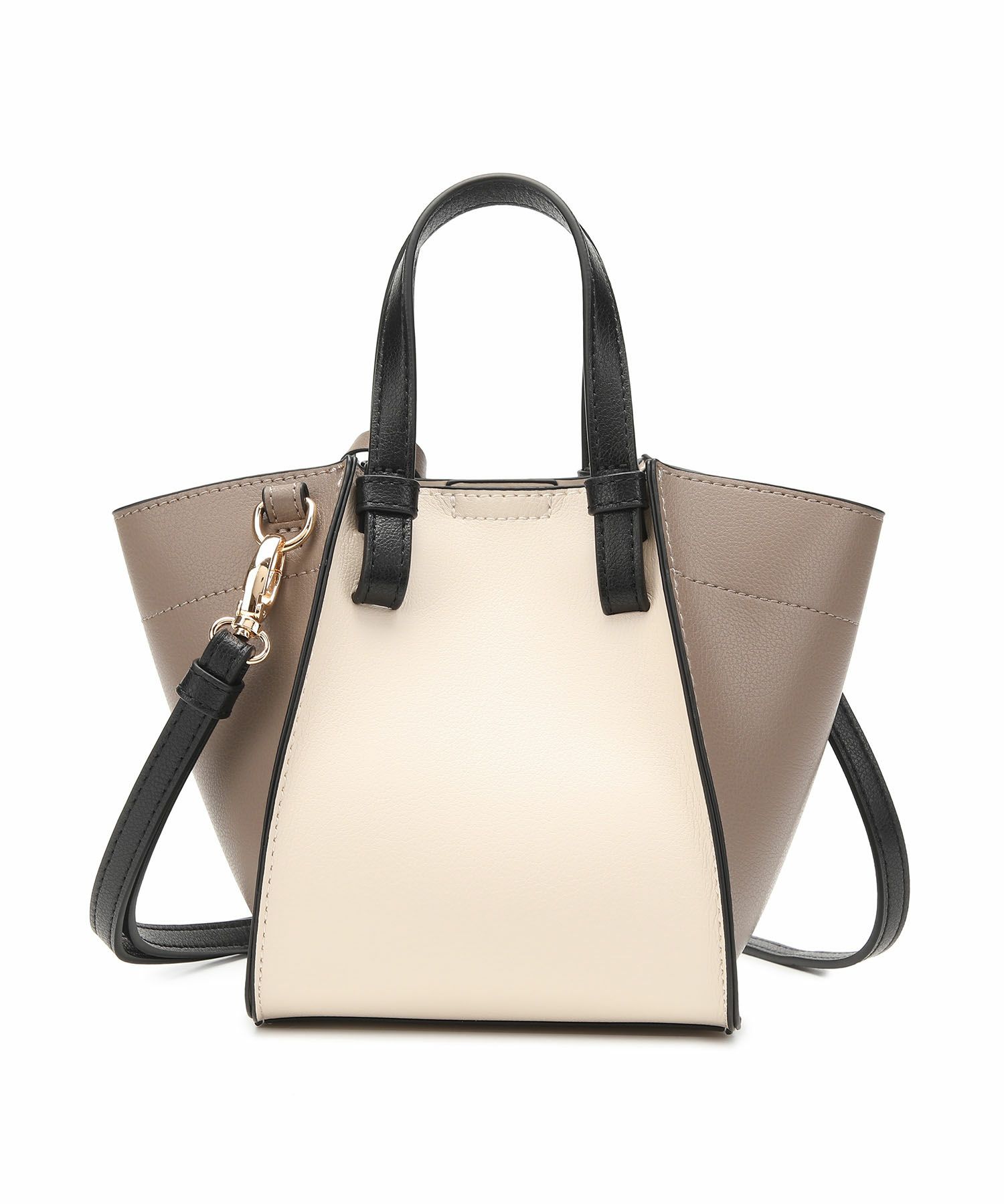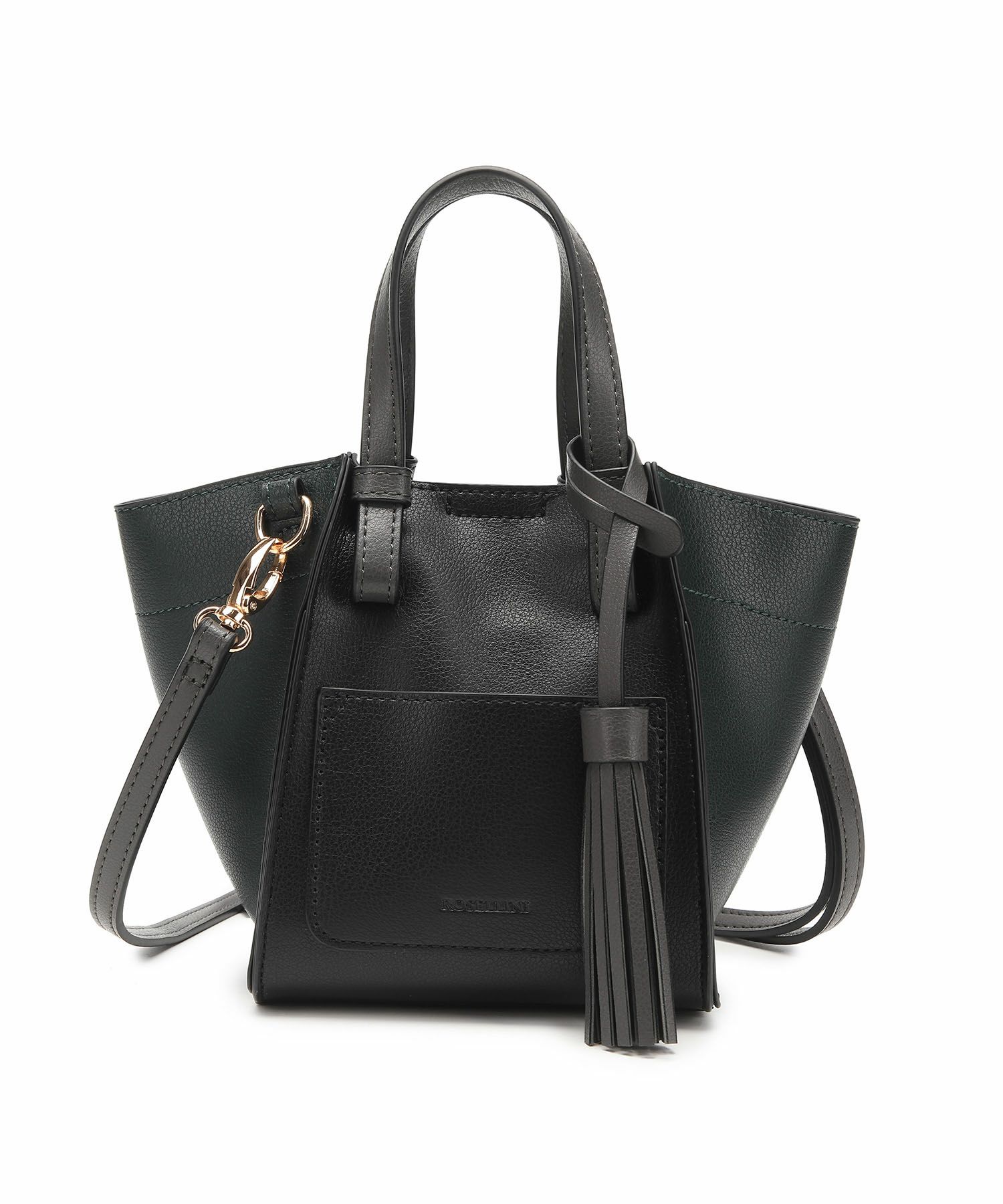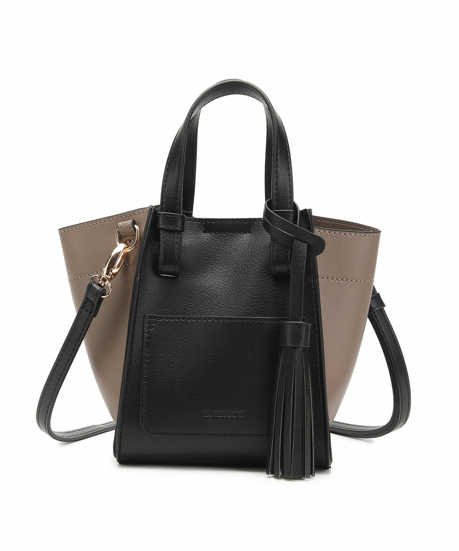 シンプルなデザインながらバイカラーと取り外し可能のタッセルチャームがアクセントになったバッグ。