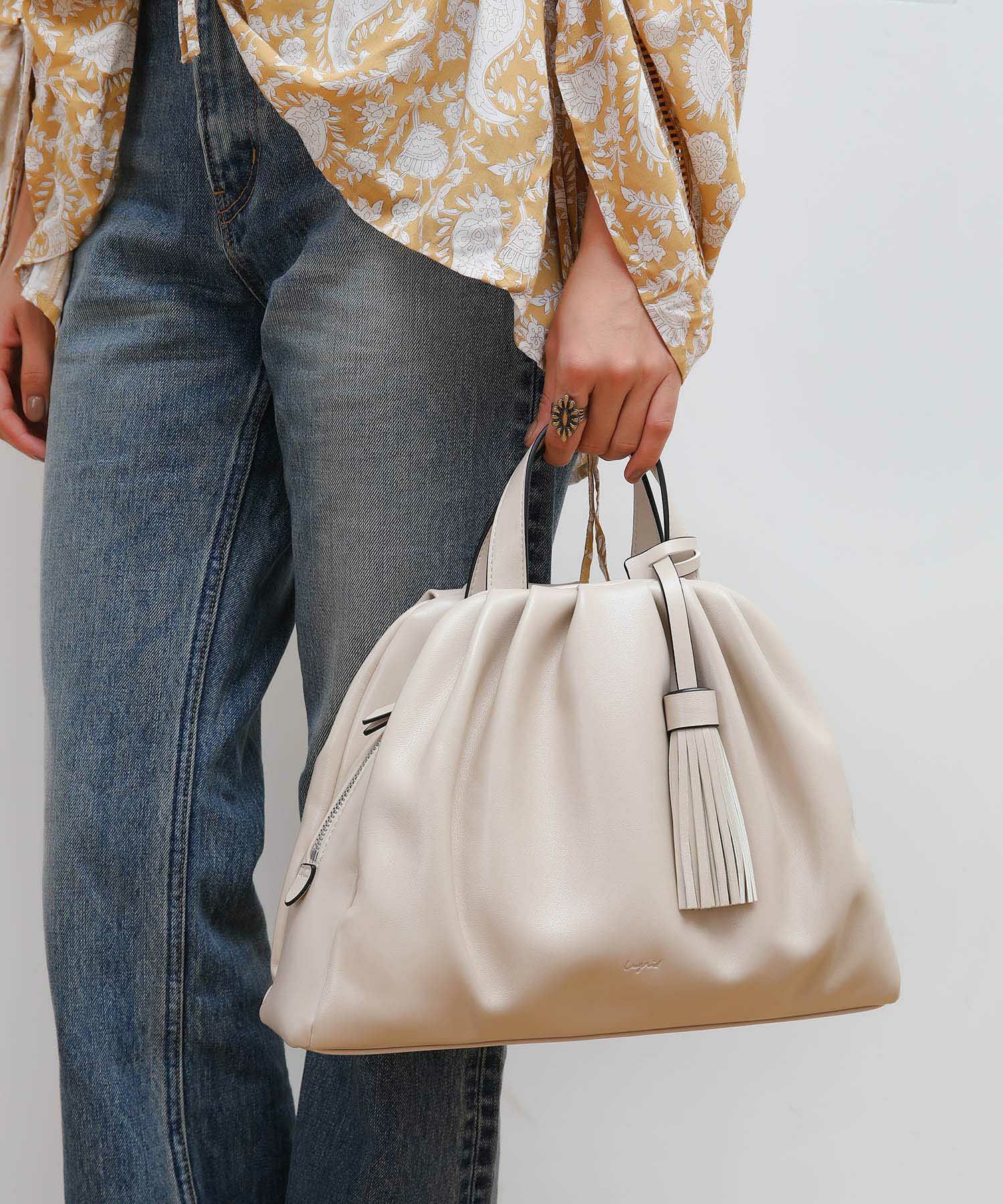 取り外し可能のタッセルがポイントで、くしゅっとしているそのこなれた雰囲気はデニムなどのカジュアルスタイルにはもちろん