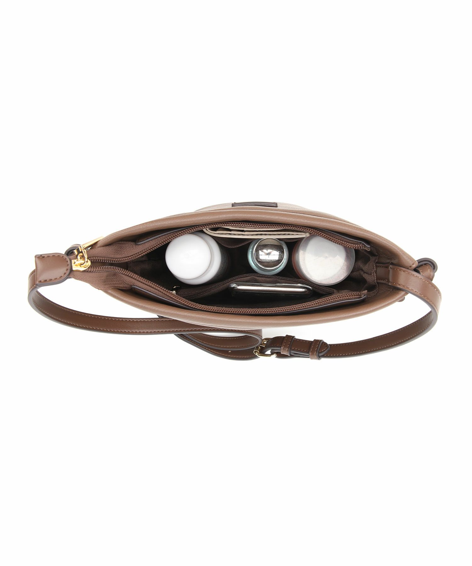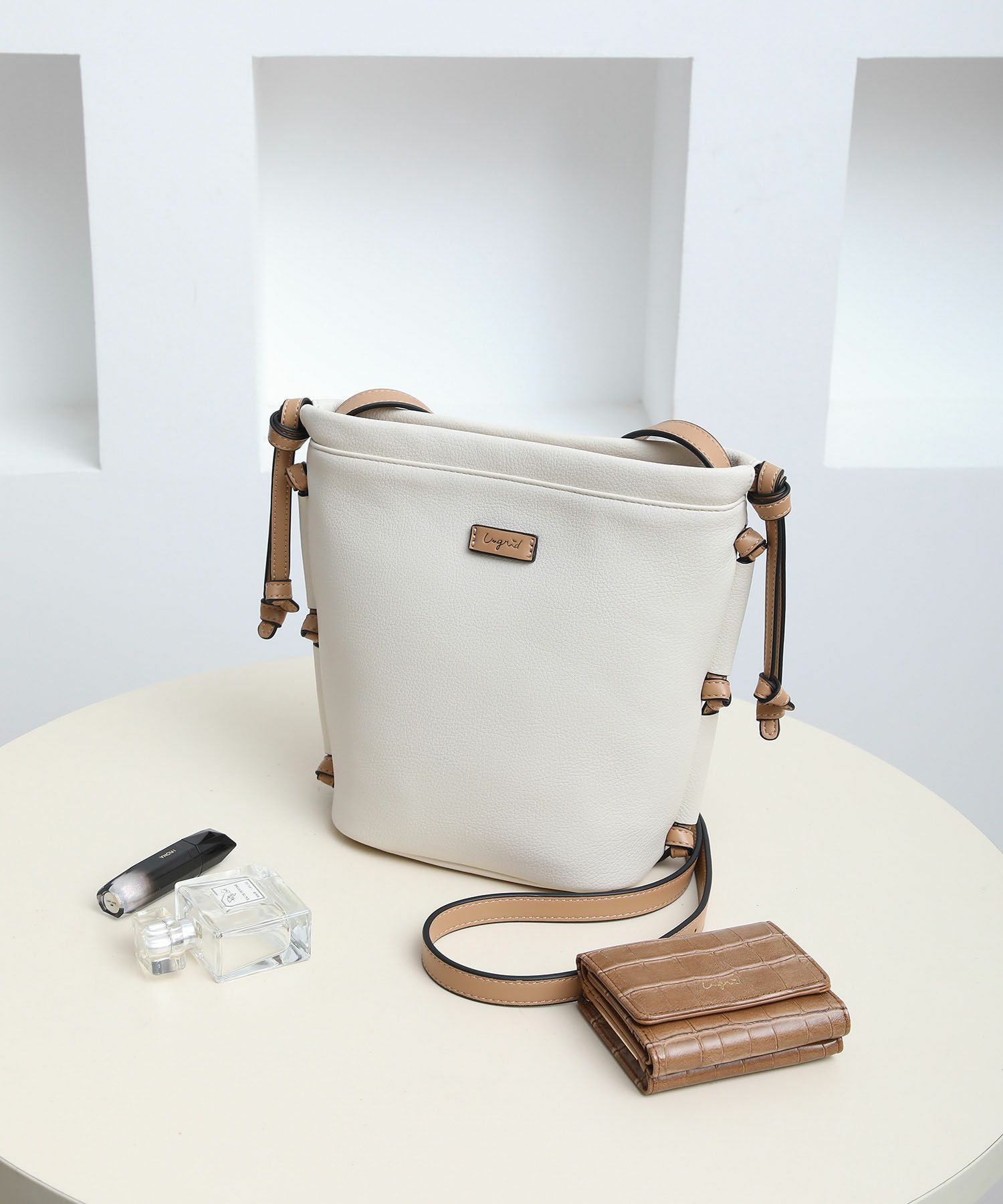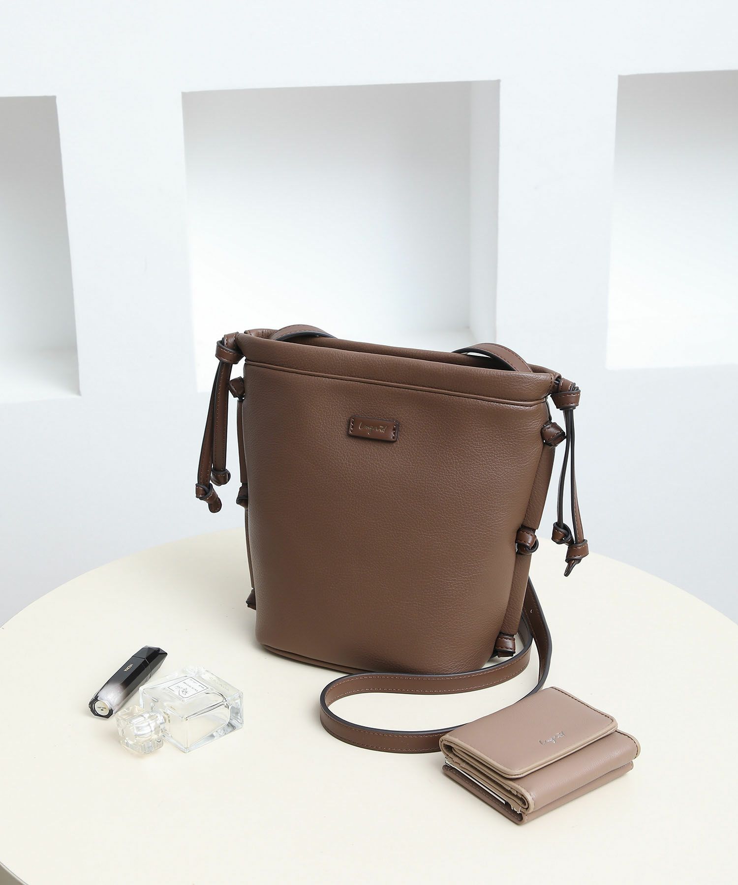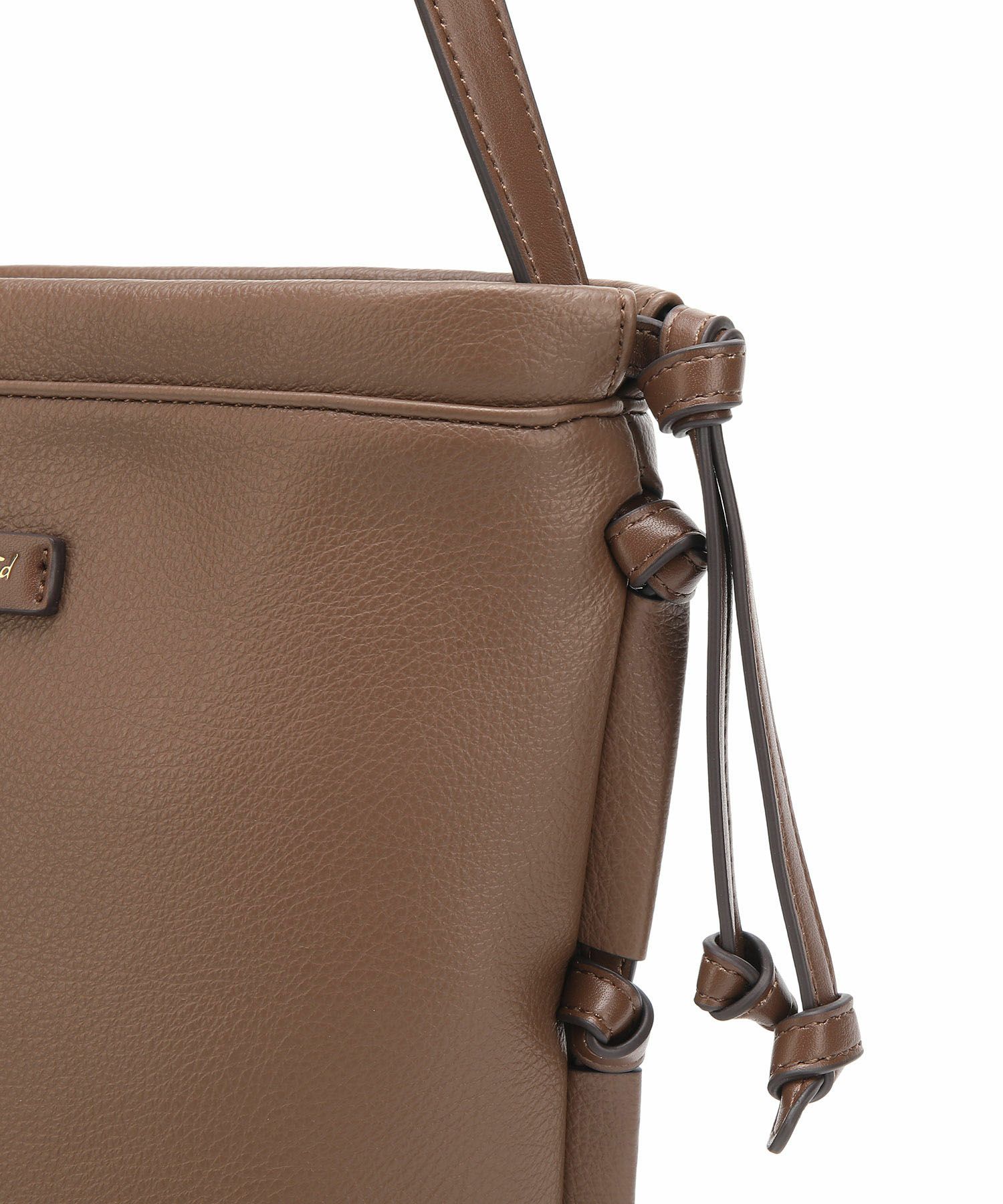 シックな色合いにショルダー部分をバッグに組み込んだ遊び心を効かせたデザインの両アオリポケットショルダーバッグ。_x005F_x000B_歩くたび揺れる両サイドの紐デザイン&配色カラーがお洒落で、