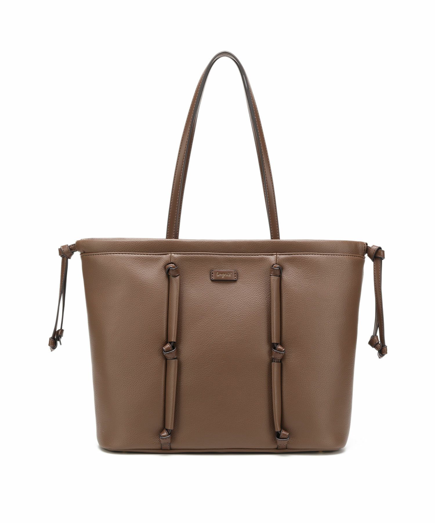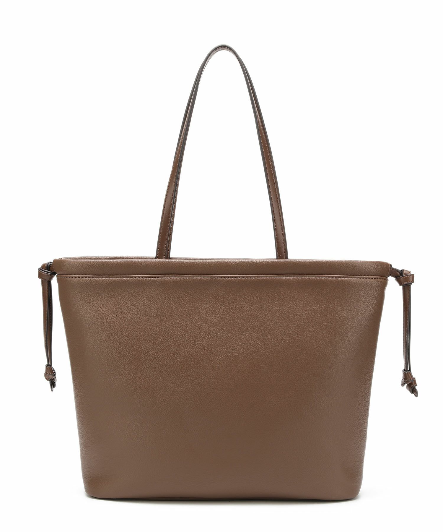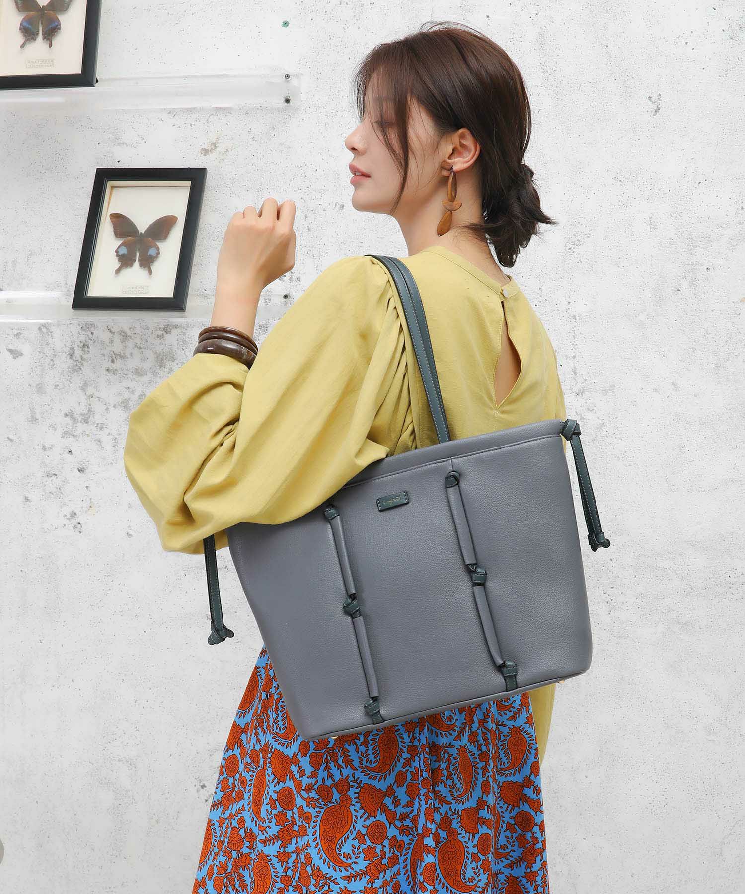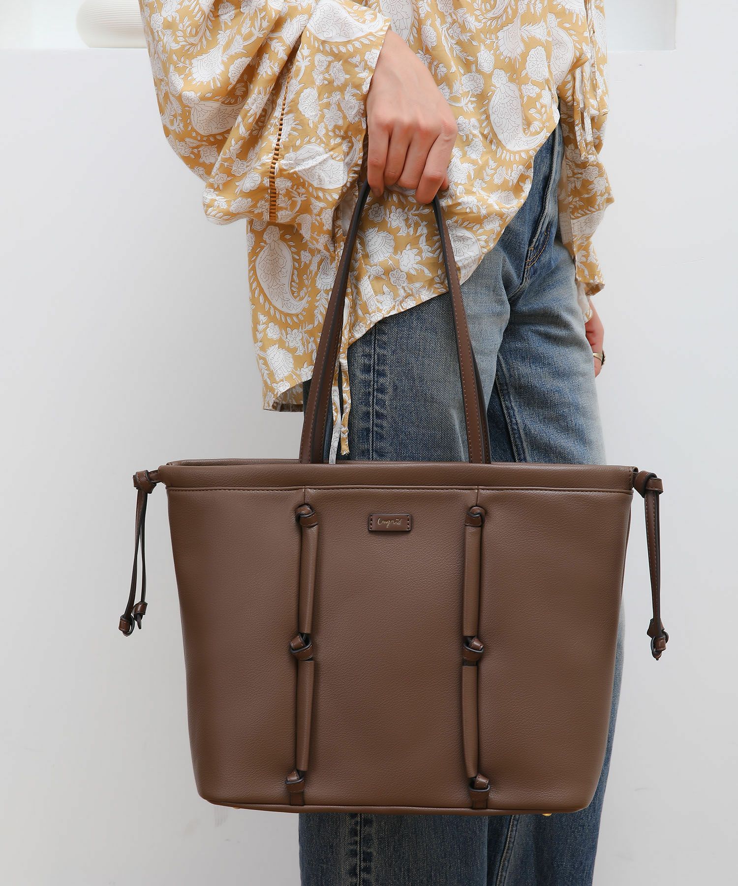 シックな色合いに持ち手部分をバッグに組み込んだ遊び心を効かせたデザインのラージトートバッグ。