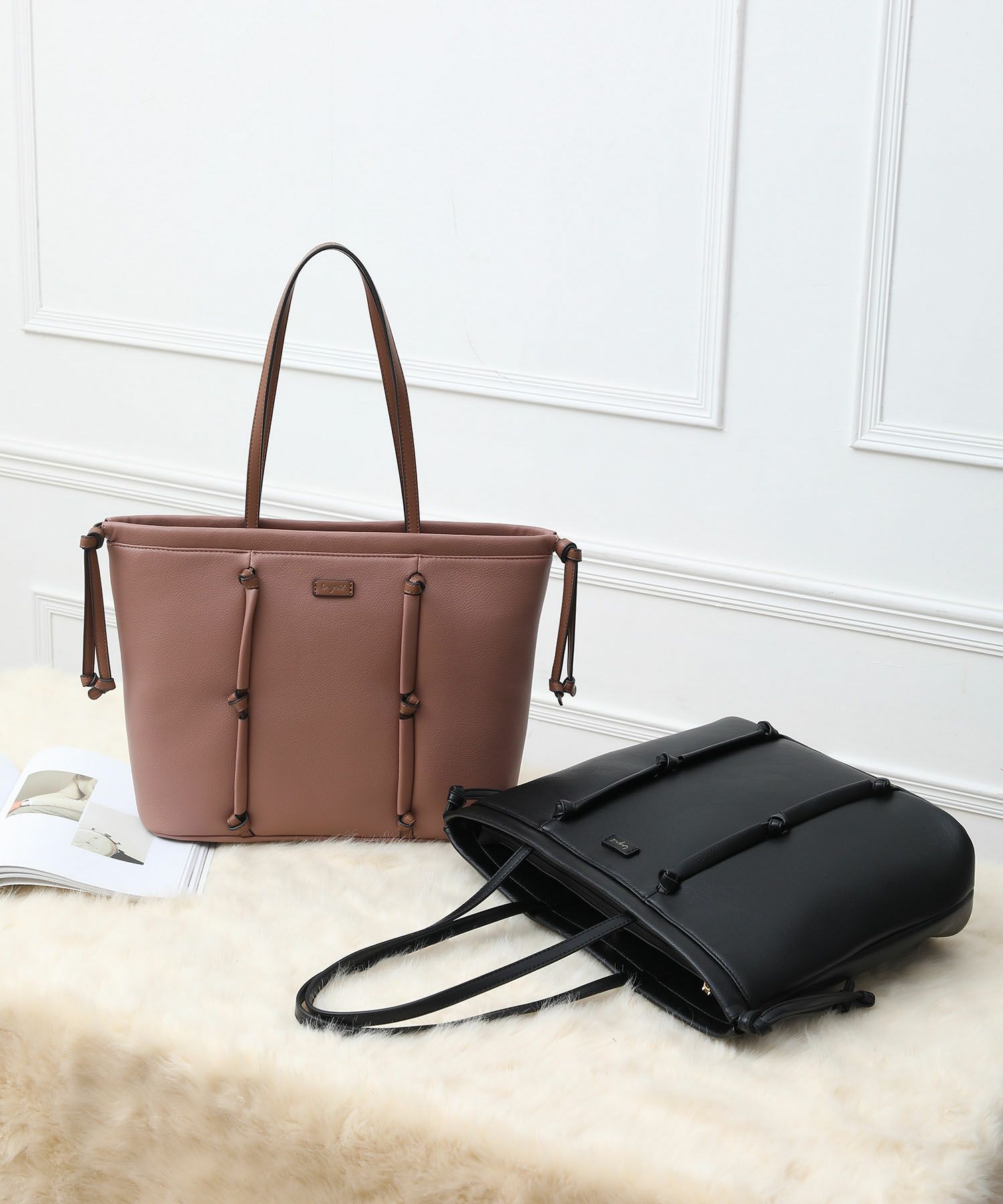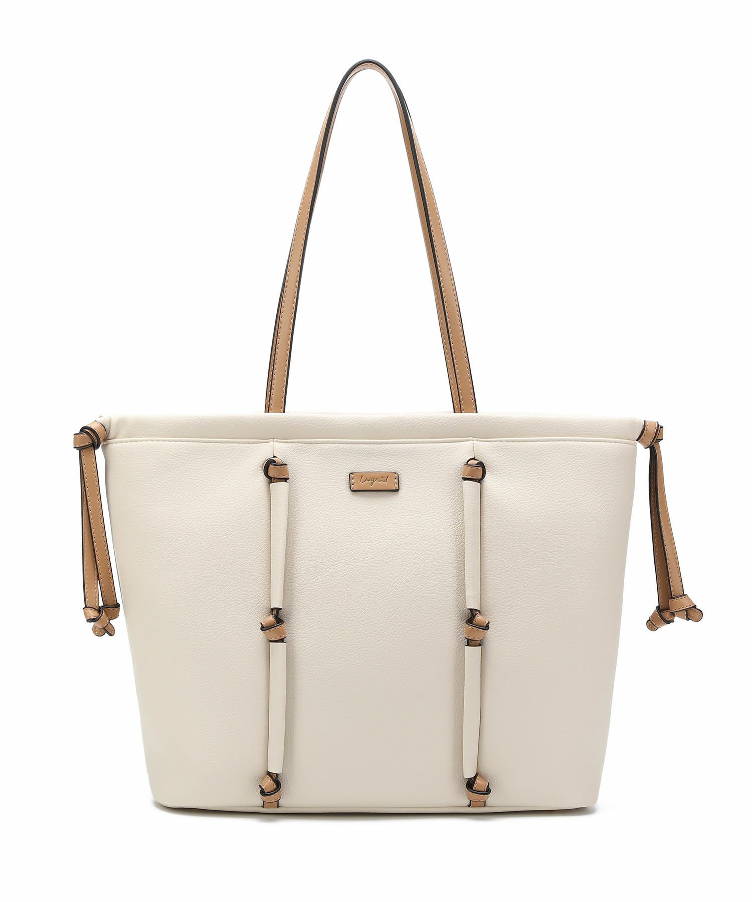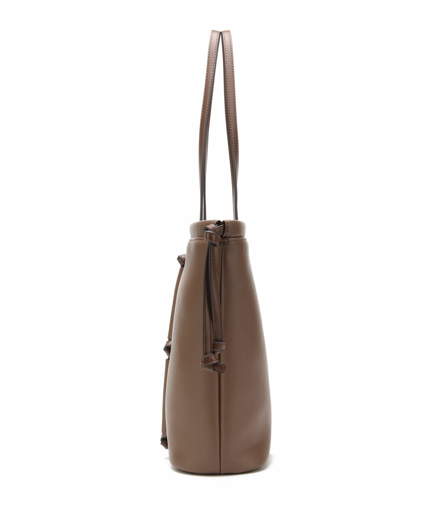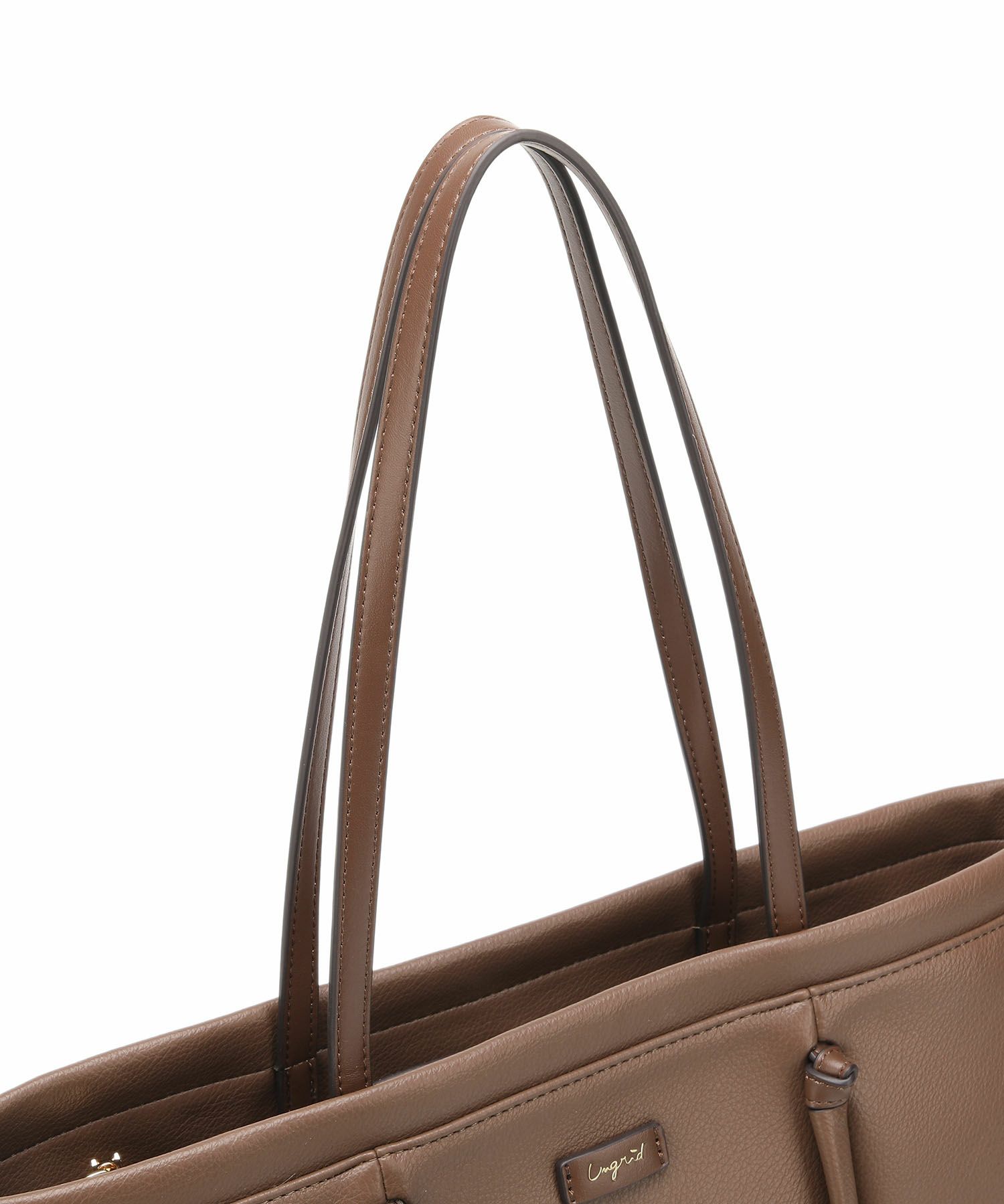 シックな色合いに持ち手部分をバッグに組み込んだ遊び心を効かせたデザインのラージトートバッグ。