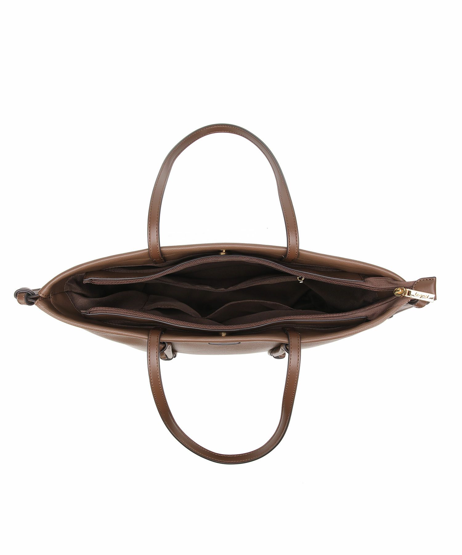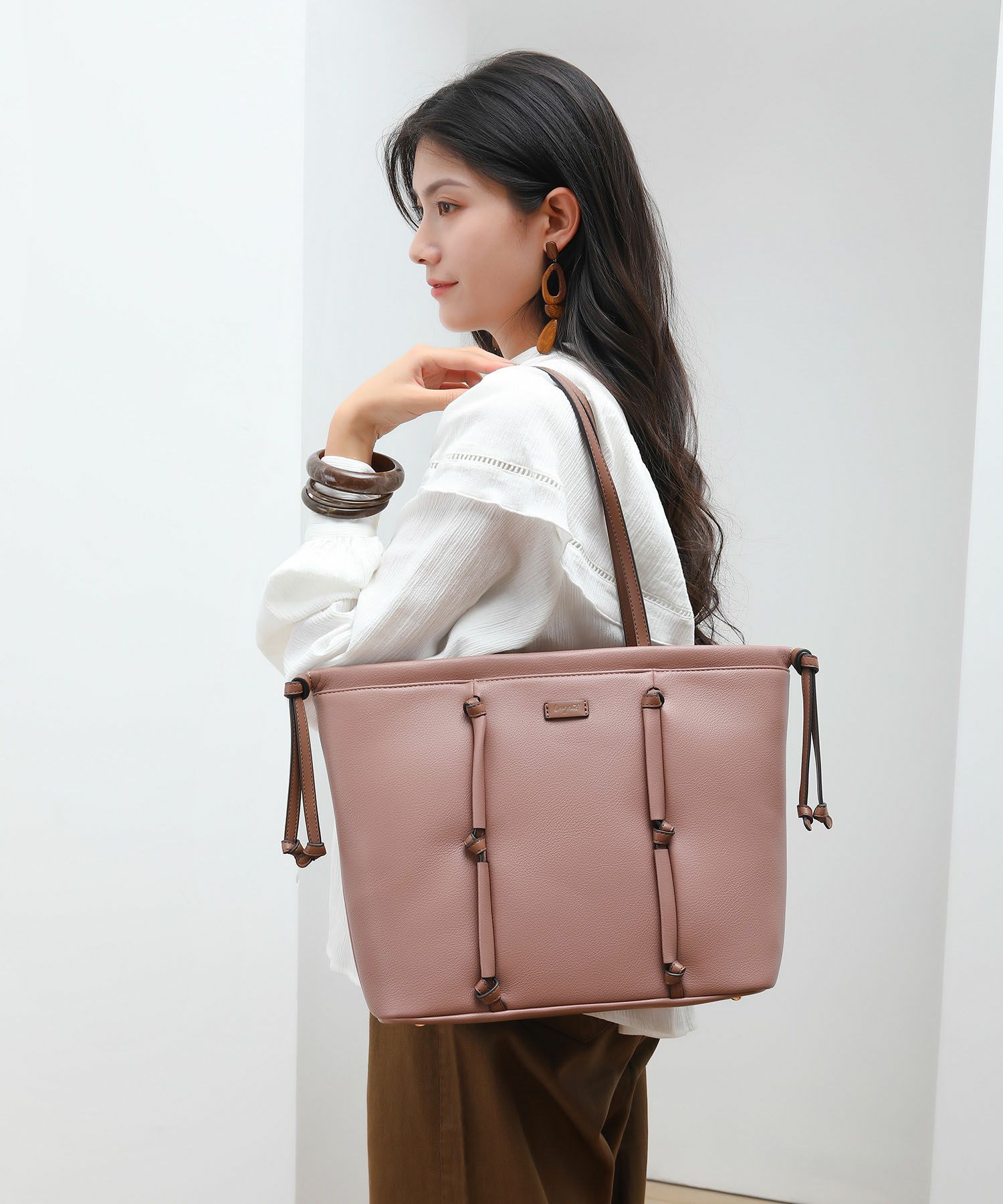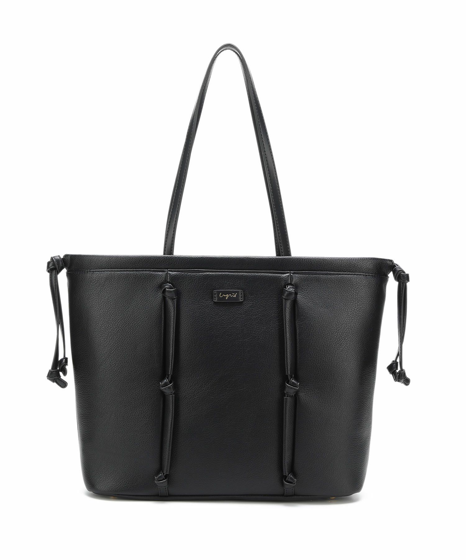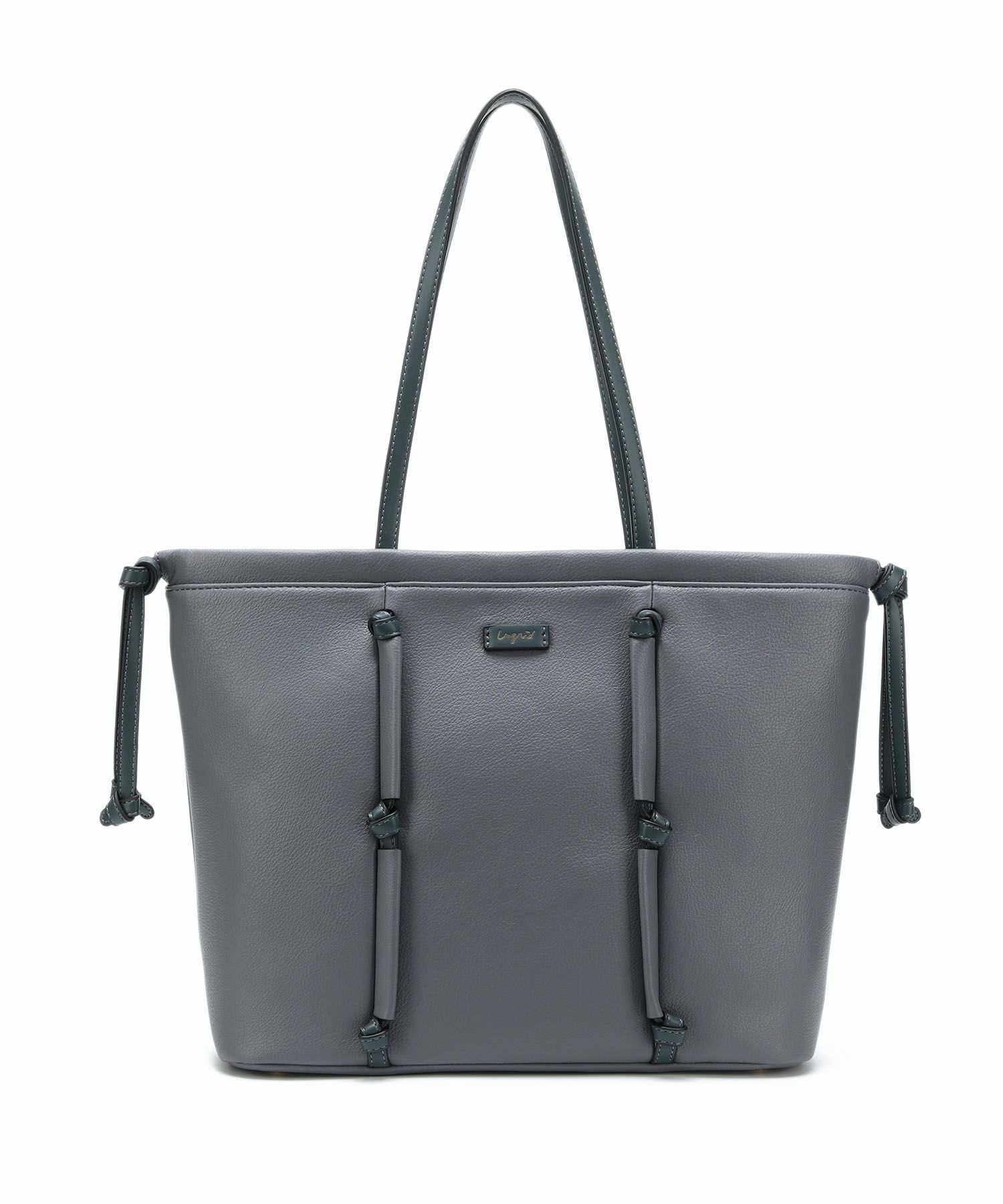 シックな色合いに持ち手部分をバッグに組み込んだ遊び心を効かせたデザインのラージトートバッグ。