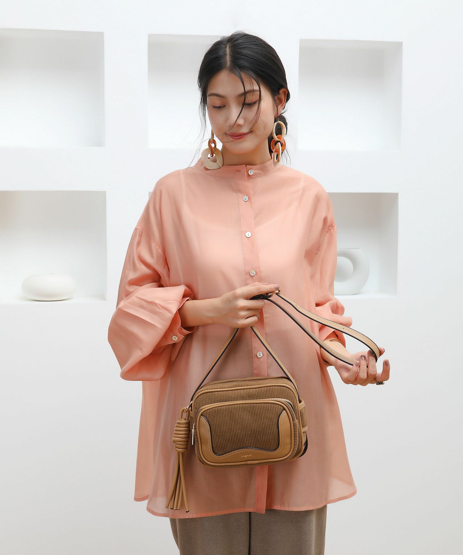 シンプルだからずっと使える、コーデュロイのショルダーバッグ。コーデュロイで季節感溢れるコーディネートに◎