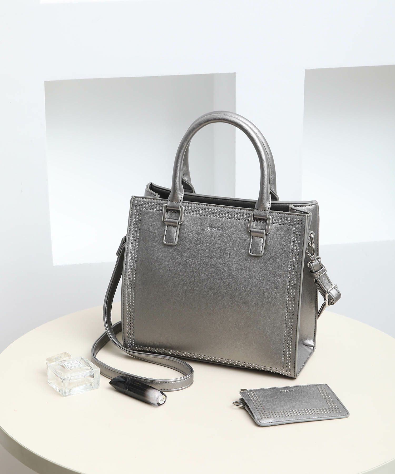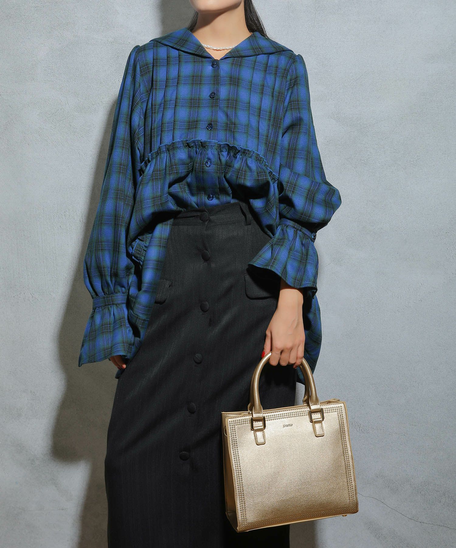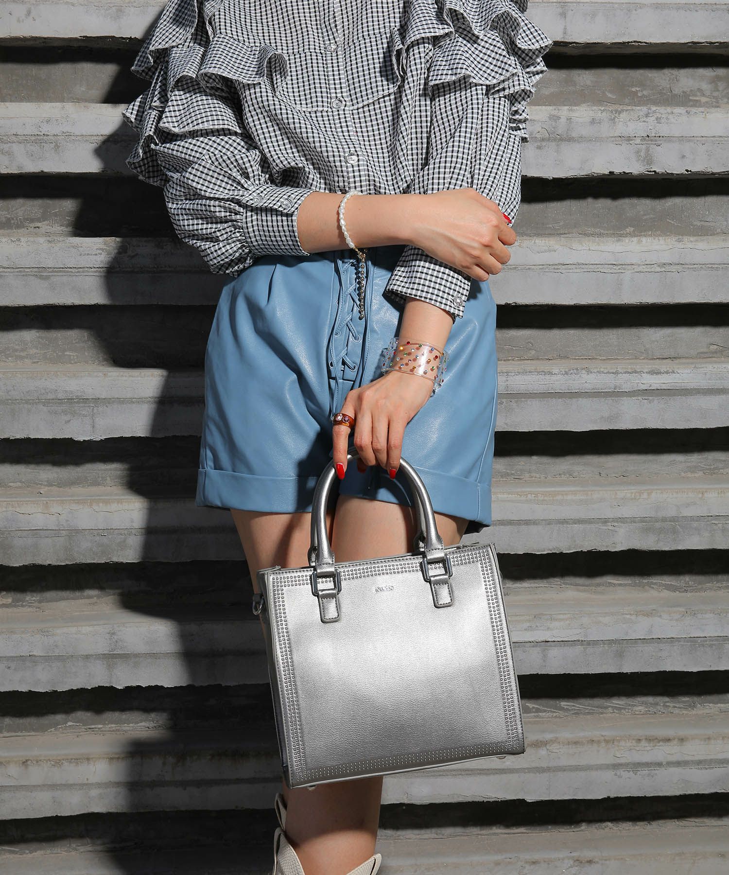 トレンドのスクエア型を意識した、モードカジュアルな雰囲気の中にもフォルムが上品なのでちょっとしたフォーマルな場でも引けを取らないデザイン。